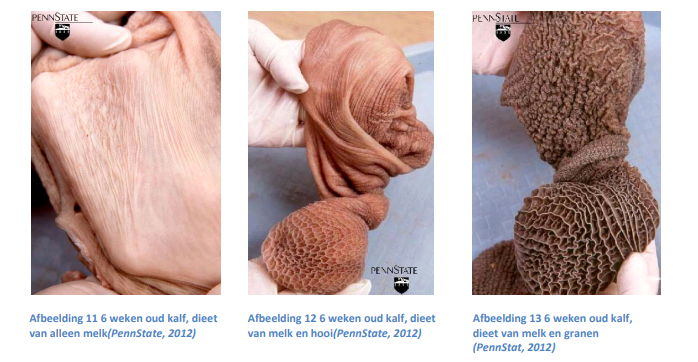 In onderstaande foto’s is te zien dat een dieet van enkel melk een slecht ontwikkelde pens tot gevolg heeft. Het kalf dat naast melk ook brok heeft gekregen, heeft de best ontwikkelde pens.